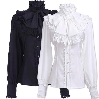 Women Retro Top Steampunk Style Turtleneck Decor Lace Long Pure Color Bow Bell Sleeves Single-breasted Shirring Pleated Cosplay Performance