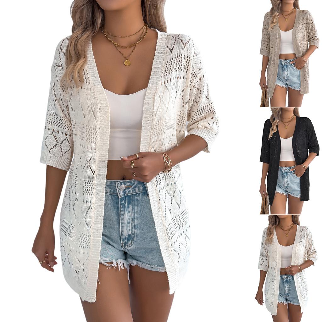 Women's Casual Solid Color Openwork Short-sleeved Knitted Cardigan/top For Vacation.
