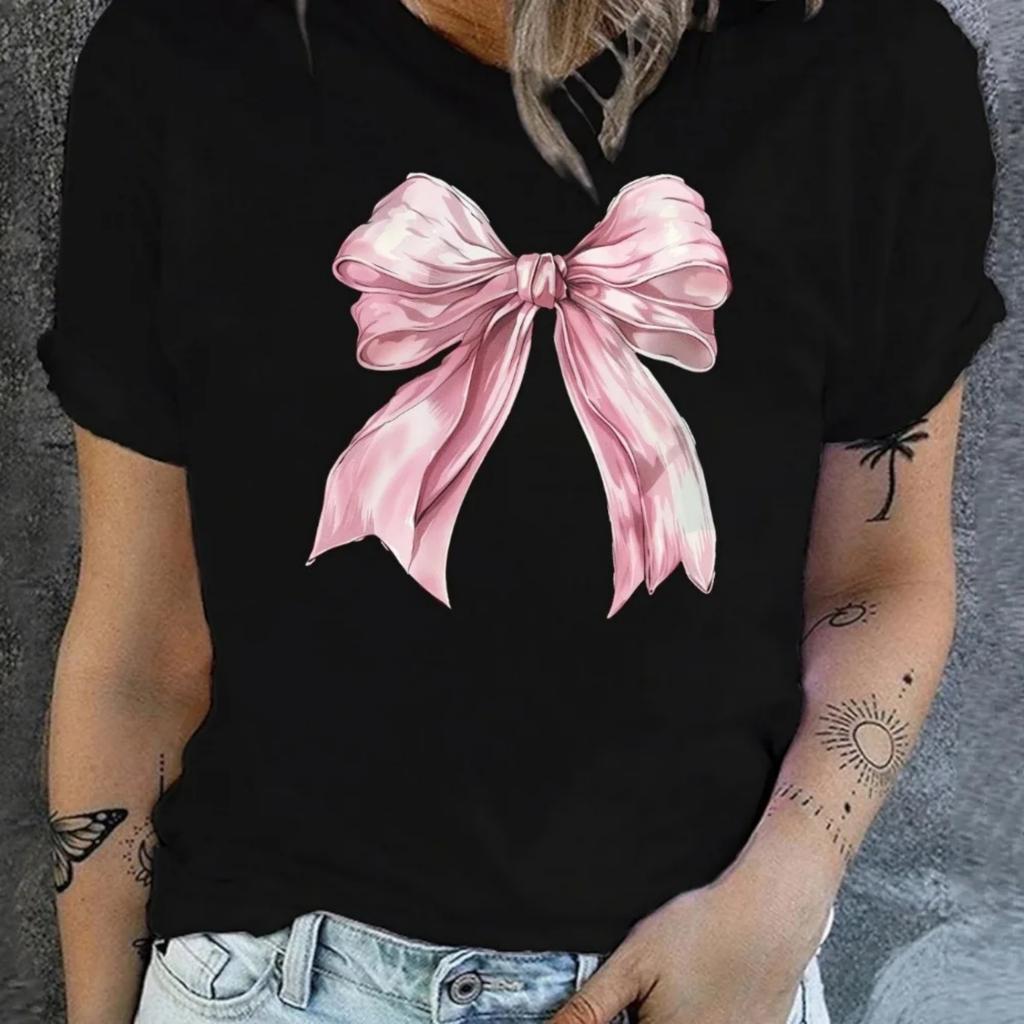 Bow Print Crew Neck T-Shirt Casual Short Sleeve T-Shirt for Spring & Summer Women's Clothing