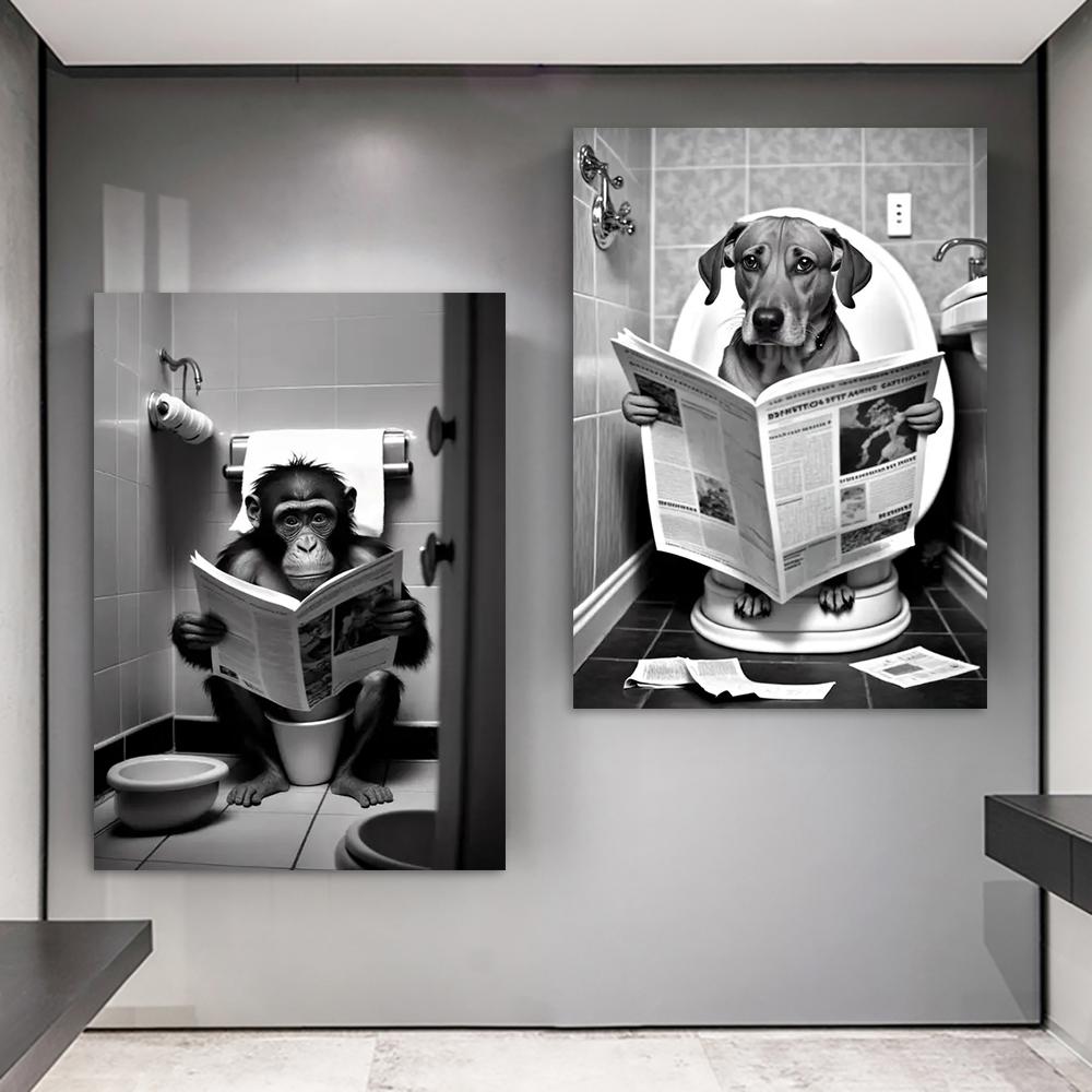 Funny Bathroom Humorous Animal Bear Dog Tiger Sitting On Toilet Reading Newspaper Canvas Painting Posters and Prints Wall Art