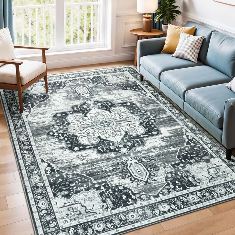 Gray Tone Persian Pattern Living Room Large Carpet Black White Gray Retro Persian Worn Texture Anti-slip Rug for Home Decor
