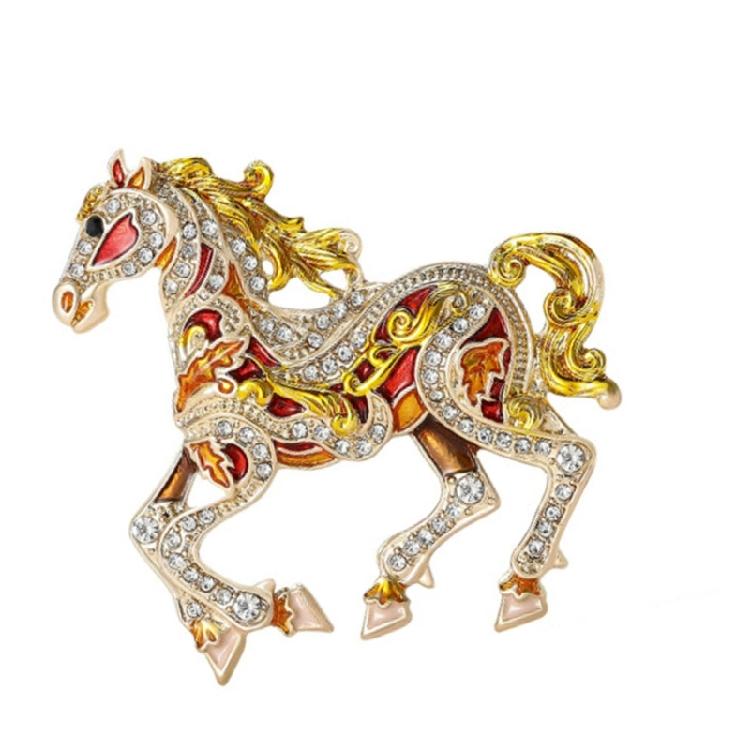 Adorable enameled horse brooch features vibrant cartoon inspired design with sparkling rhinestones accents, combining playful charm and elegant craftsmanship for versatile accessorizing.