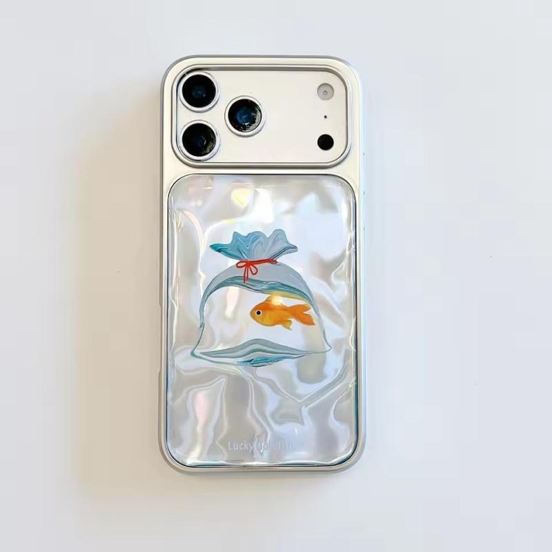 Cute Luck Goldfish Bag Water Ripple Silver Border Drop Glue Shock Proof Phone Cover Case for iPhone 17 16 15 14 Pro Max