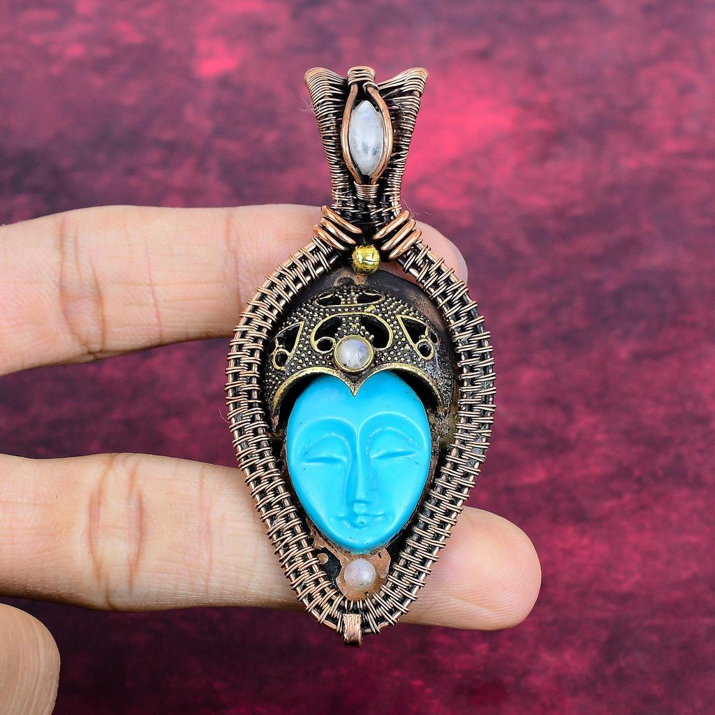 Blue Carved Bone Face Pendant Copper Wire Wrapped Pendant Handmade Jewelry Rainbow Moonstone Pendant Gemstone Copper Jewelry