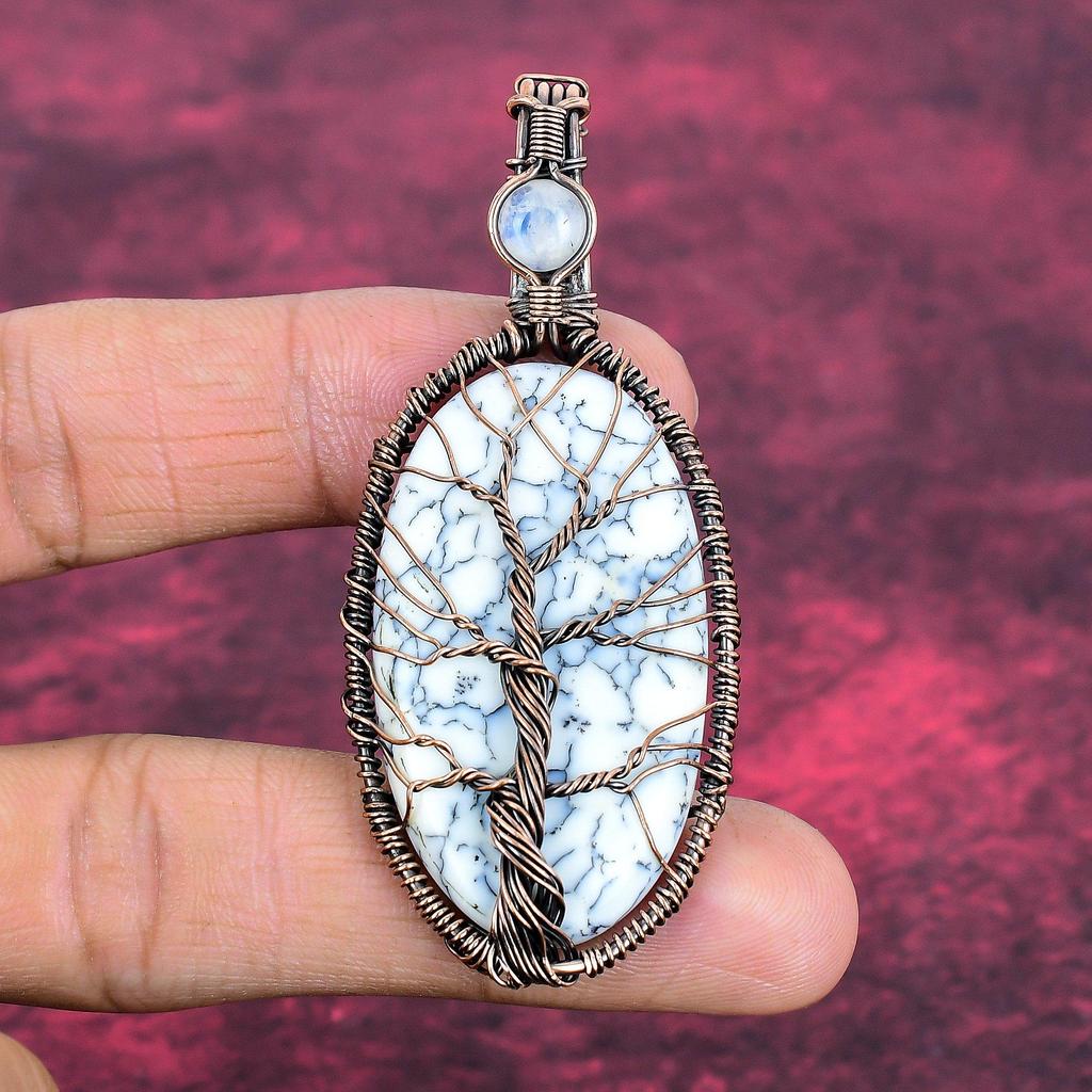 Tree Of Life Dendrite Opal Pendant Copper Wire Wrapped Rainbow Moonstone Jewelry