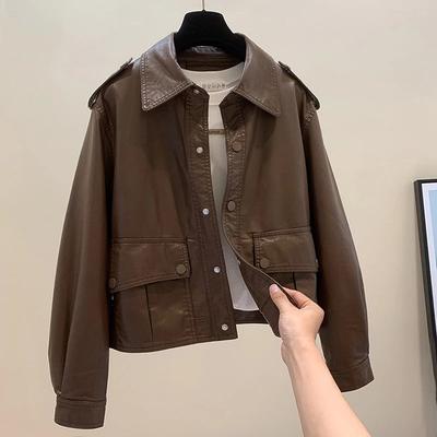 Brown Leather-Like Jacket Women's Hong Kong Style Autumn Winter Loose Fit American Vintage Motorcycle Jacket Top
