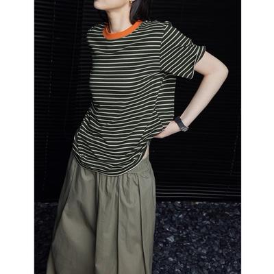 Coolhut Color-Blocked Striped Slim-Fit Knit Short-Sleeve Round-Neck Lightweight Versatile Casual Simple 2025 Summer Women's T-Shirt