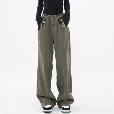 Women's Straight Jeans 2023 Winter Clothing American Retro Green Y2k Waist Wide Leg Pants Street Loose Harajuku Denim Trousers