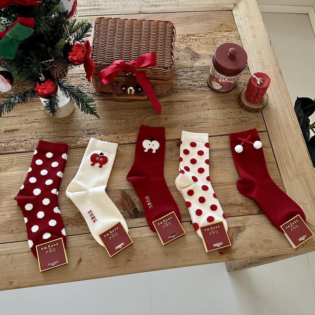 Songmu'S Ping An Xile Red Socks Polka Dot Medium Socks New Year'S Red Sox Niche Design Socks
