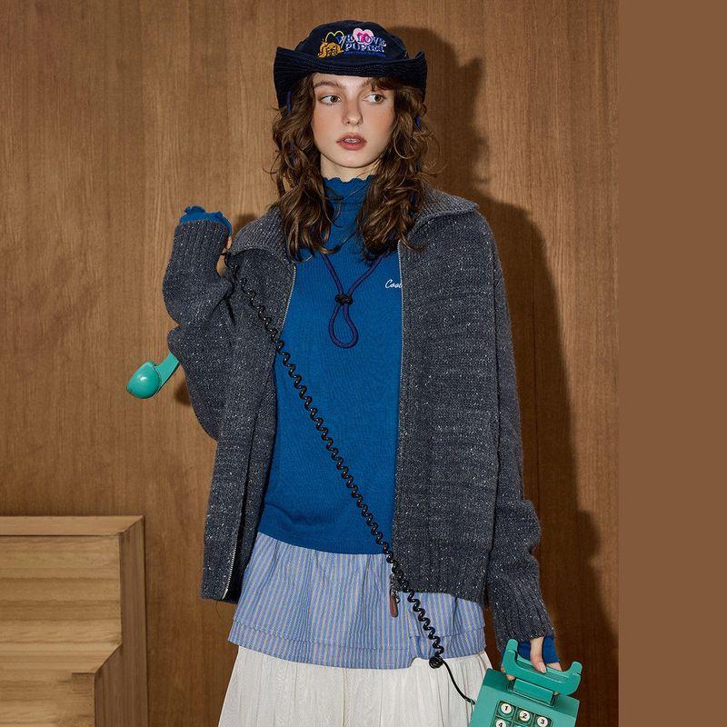 Coolhut Retro Dark Color Lapel Double Zipper Lazy Style Chunky Knit New Cardigan Jacket for Women