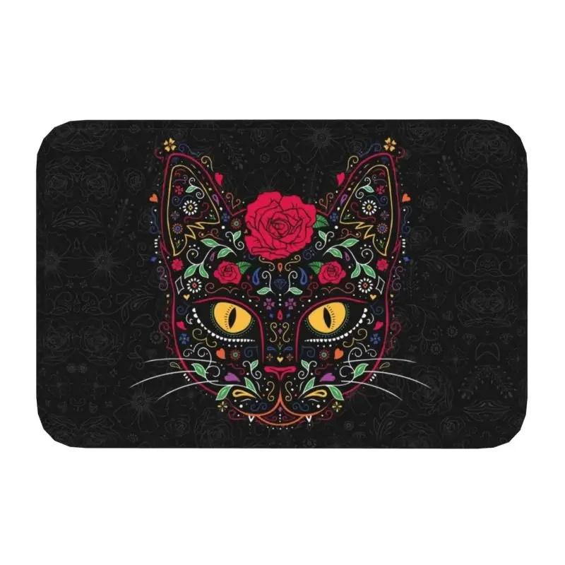 Day of The Dead Kitten Cat Sugar Skull Front Floor Door Entrance Mats Outdoor Mexican Halloween Floral Doormat Garden Carpet Rug