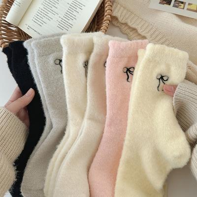 Thick Australian Fleece Women's Socks for Autumn and Winter, Winter Warmth, Color-blocked Pile Socks, Bow Embroidery, Fleece Home Socks