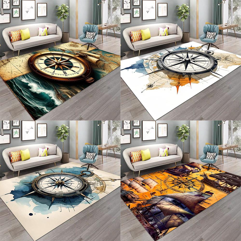 Nautical Compass Carpet Set of 4 Vintage Sailing Map Design Non Slip Floor Mats for Living Room Coastal Decor
