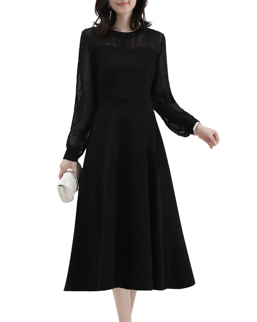 The cool neckline makes it easy to coordinate with any hairstyle. The dotted tulle adds dimension and breaks the monotony. The tucked-in waist design and flared A-line hem create a defined silhouette. The flared A-line skirt covers your buttocks, creating a flattering effect. The shin-length dress creates a sophisticated, mature look.
