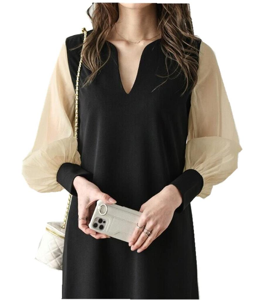 This long dress features sheer sleeves that create a feminine look. Slits on both sides of the hem give it a more refined and sophisticated feminine feel. Just wearing it gives off a luxurious feel, making it easy to become a sophisticated woman. The voluminous sleeves subtly cover areas around the arms that can be a concern. They don't feel too tight, so you can also expect a figure-flattering effect. The deep V-neck also creates a beautiful look for your décolleté.