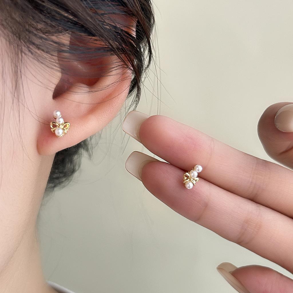 Light Luxury Simple Small Fragrant Style Bow Pearl Stud Earrings Daily Commuting Fashion Temperament High-End Earrings