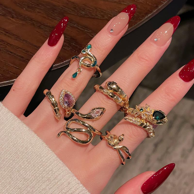 Medieval Retro Fashion Gold Serpentine Open Ring Elegant Exquisite Zircon Personalized Accessories Women
