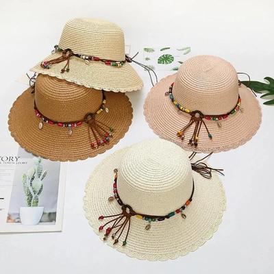 Spring Summer Folding Straw Hats Wide Brim Women's Sun Hat Bohemian Beaded Strap Straw Hat Girls