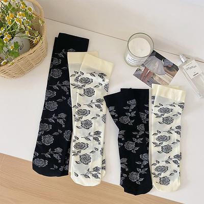 Ladies Spring and Summer Thin Style Retro Dark Rose Flower Calf Socks
