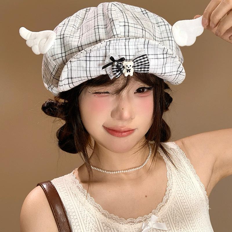 Japanese Cherry Plaid Patch Turned Brim Beret Children Spring and Summer Sweet Versatile Face Small Cloud Hat