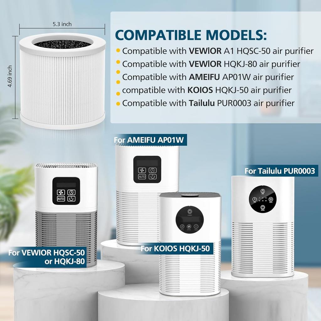 2 Pack A1 Replacement Filter Compatible with VEWIOR Air Purifier Hqsc-50, Hqkj-80, Ameifu Ap01w, Koios Hqkj-50, H13 True Hepa Filter for Vewior A1w