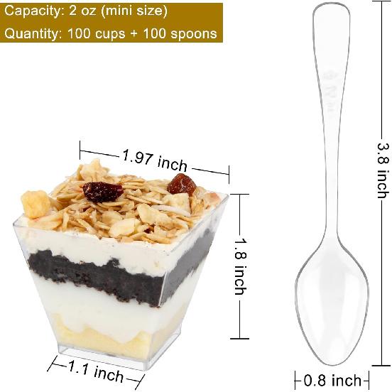 Colovis Mini Dessert Cups, 100 CT 2oz Clear Plastic Parfait Appetizer Cups with Spoons Mini Square Dessert Bowls for Serving, Tasting (100)