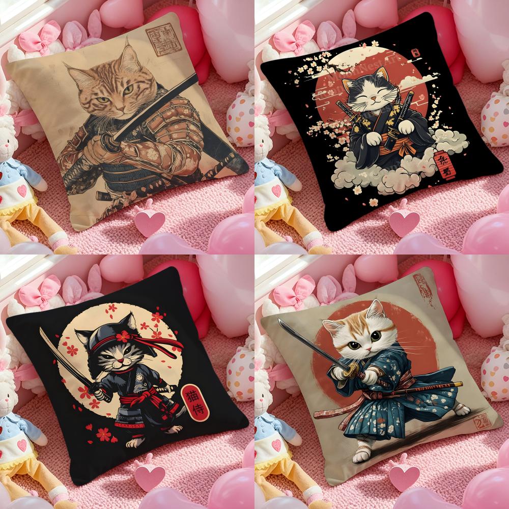 Japanese Style Samurai Cat Cushion Cover Pattern Printed Pillowcase for Living Room Sofa Cushion Cover & Bedroom Decor