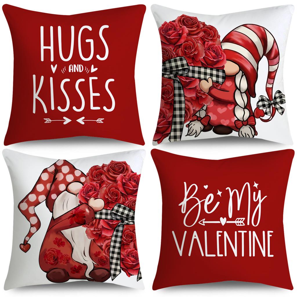 4pcs Valentine'S Day Throw Pillow Covers - Hugs and Kisses Gnome Rose Heart Design, Zip Closure, Polyester 100., Contemporary Style