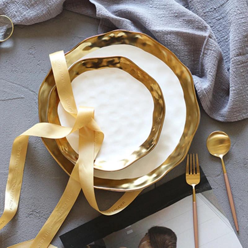 Ceramic White Steak Plate With Gold Edge Breakfast Tray Retro Bowl Dessert Pasta Dishes Western Food Container Ramen Bowl 1pcs