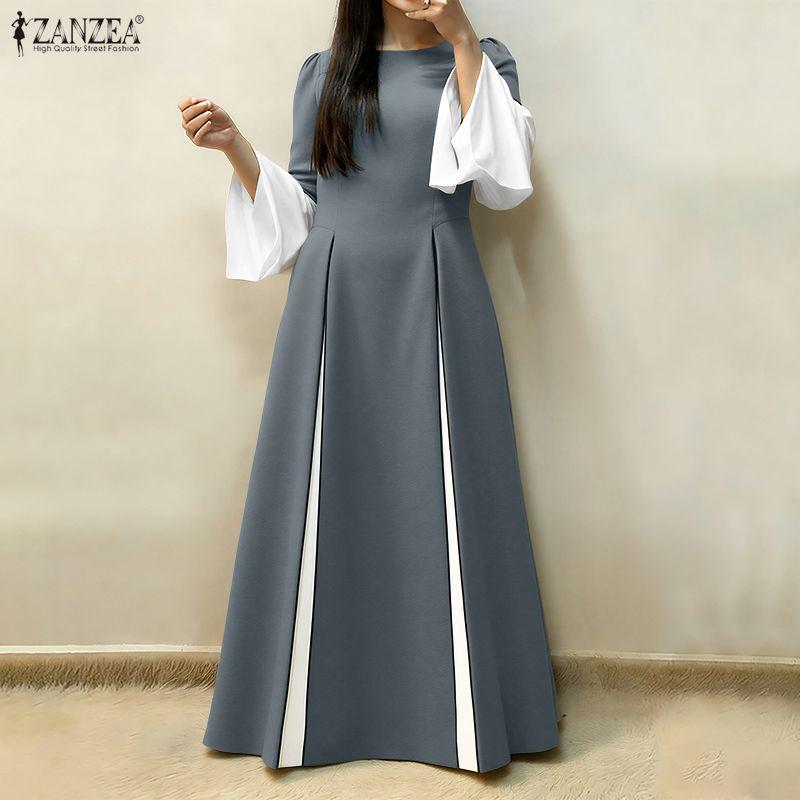ZANZEA Women Casual Round Neck Long Sleeve Loose Long Dress