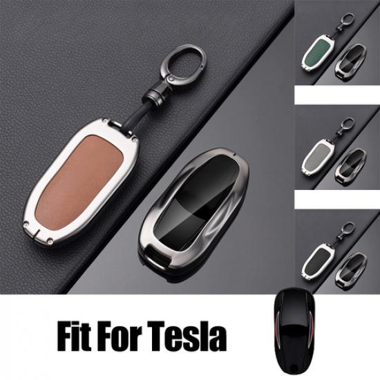 Zinc Alloy Leather Car Key Fob Case Cover With Kechain For Tesla Model X 2016-20
