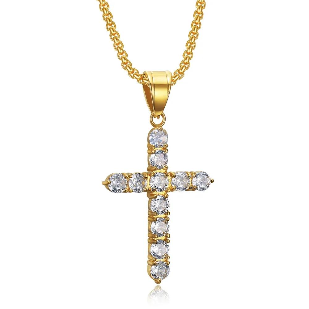 Religious Iced Out Bling Small Jesus Cross Pendant Gold Color Stainless Steel Zircon Christian Necklace For Women Jewelry Gift