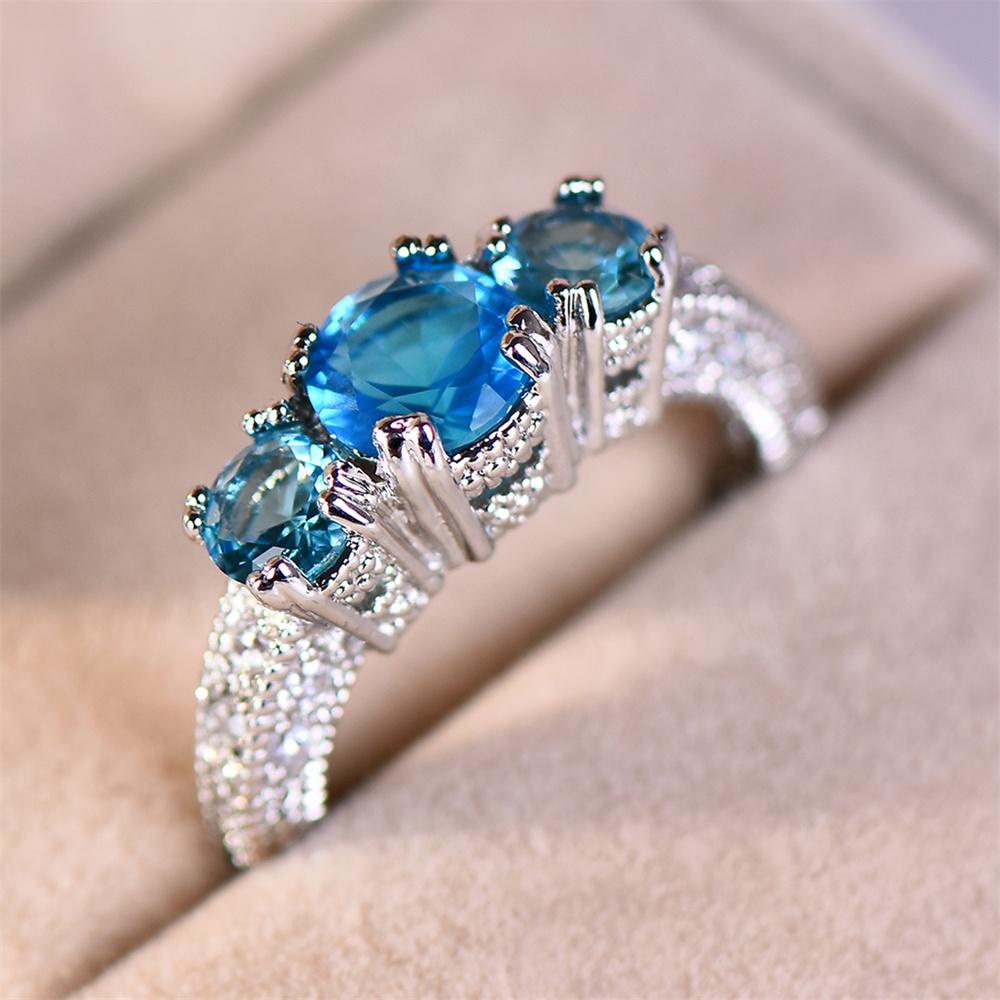 Aqua Blue Crystal Round Stone Engagement Rings For Women Classic Silver Color Wedding Band Jewelry Accessory Girls Birthday Gift