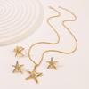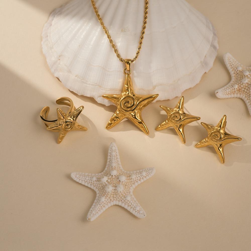 Summer Beach 14k Gold Plated Vintage Threaded Starfish Necklace Earrings Open Ring Set Women Charm Jewelry Gift