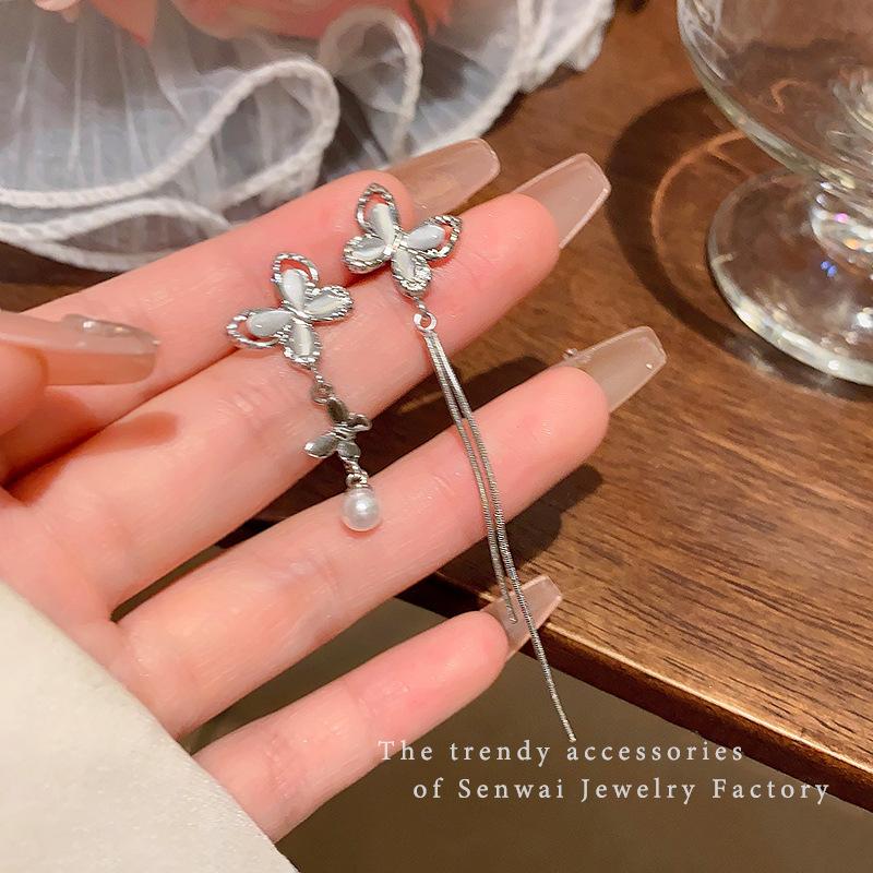 Opal Butterfly Fringed Earrings Femininity Long Pearl Stud Earrings