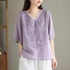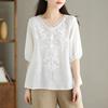 Solid Color Cotton and Linen Mid-sleeved Shirt Women's Summer V-neck Heavy Industry Embroidery Casual All-match Thin Cotton and Linen Shirt