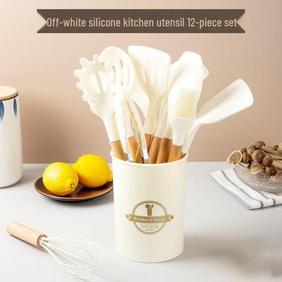12-Piece Silicone Kitchen Utensil Set with Wooden Handles and Storage Barrel - Non-Stick Cookware