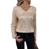 Women Tops V-Neck Lantern Long Sleeve Pullover Tops Loose Fit Solid Color Shiny Sequins Party Blouse Streetwear