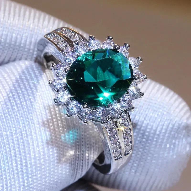 Luxury Green Crystal Ring Princess Crown Halo Engagement Wedding Rings Cubic Zircon Sterling Silver Rings For Women