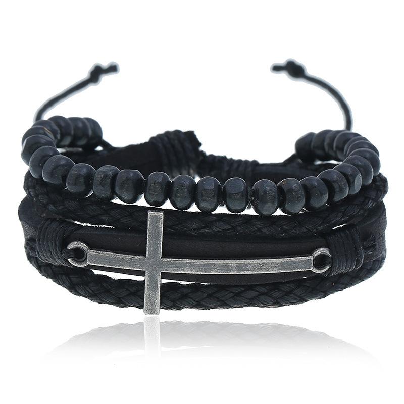 Retro Cross Layer Bracelet For Men Punk Black Hand Woven Cowhide Leather Adjustable Bead Bracelet Accessories Christian