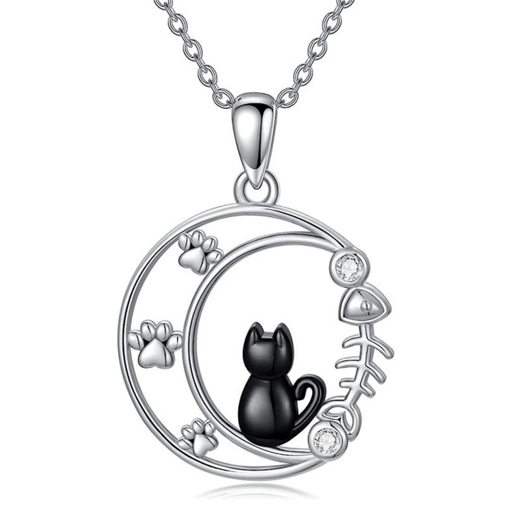 Charm Female Cat Moon Animal Pendant Necklace Vintage Silver Color Wedding For Women