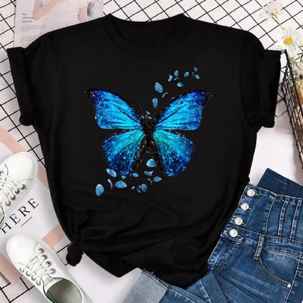 New Blue Butterfly Floral Printed T-Shirt Women's Summer Casual Short Sleeve O-neck Tops 90s Fashion Graphic Female Tops Tees