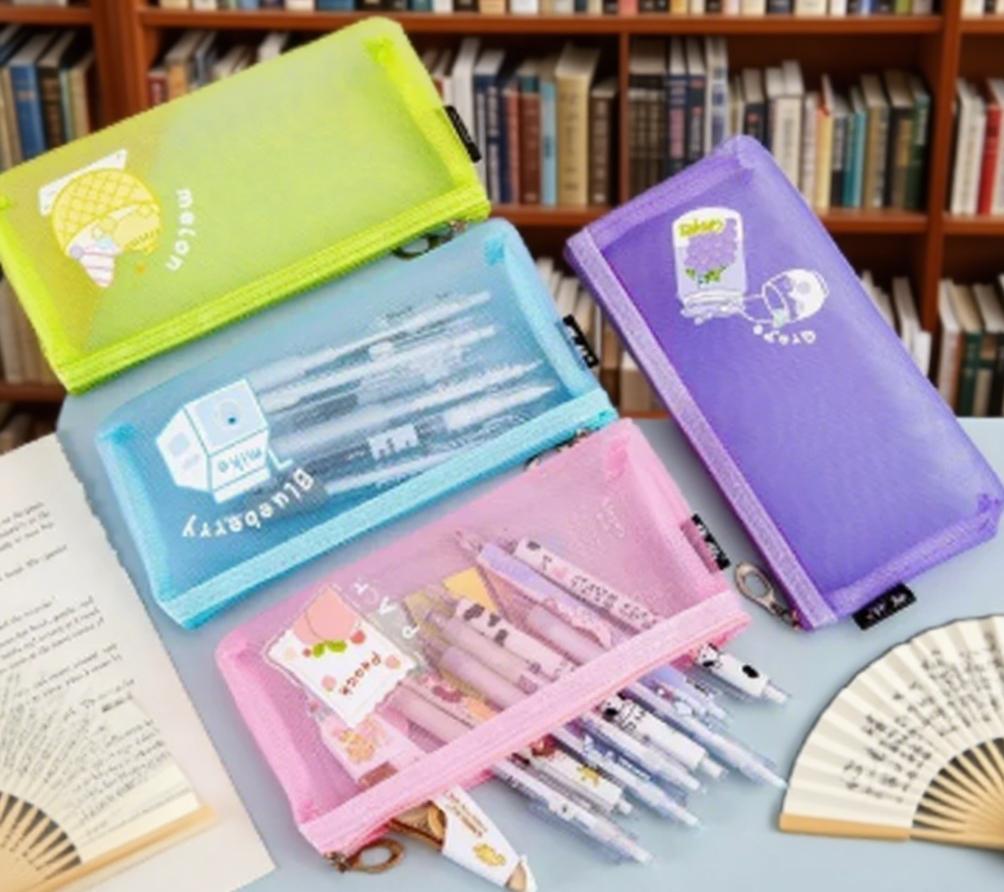 Cute Cartoon Mesh Pencil Case Large Capacity Transparent Stationery Storage Bag Cosmetic Organizer for Girls School Supplies