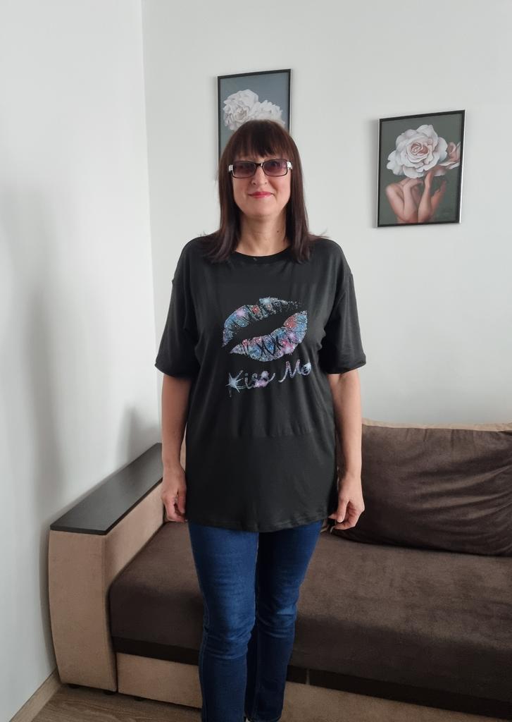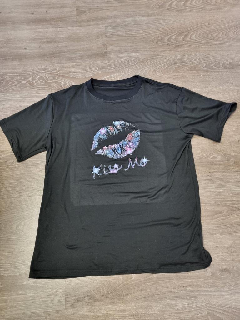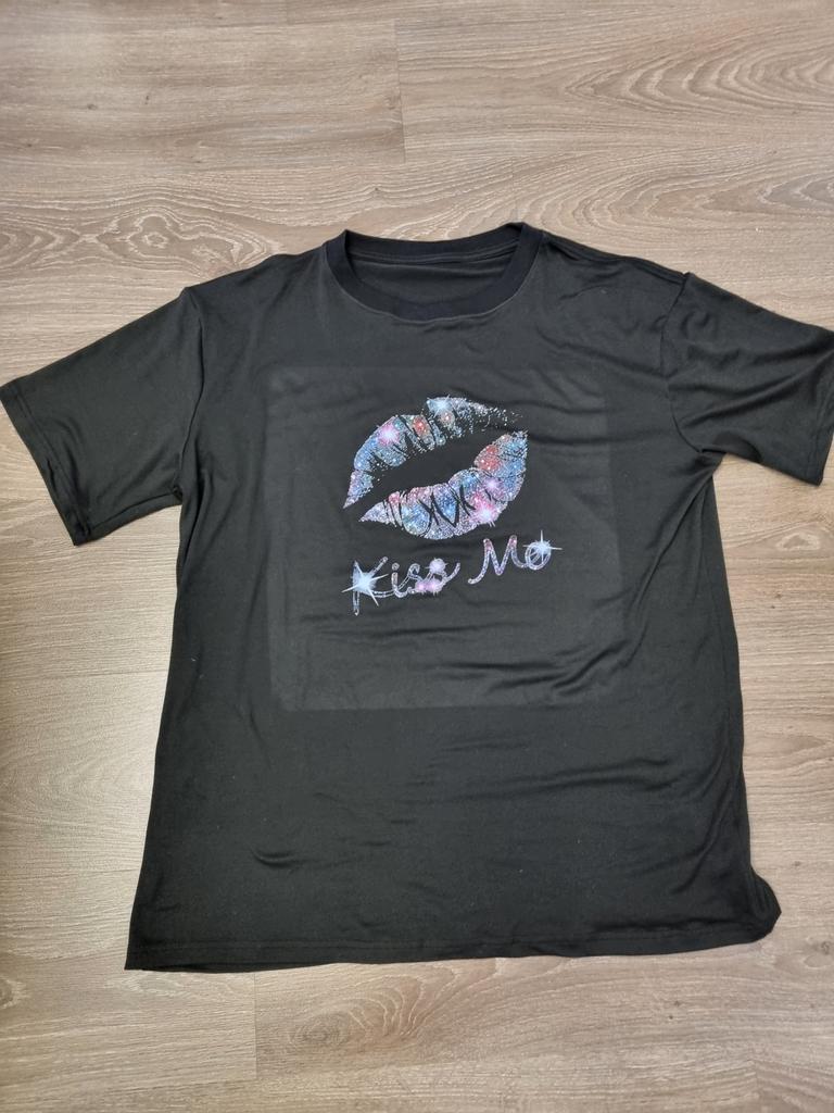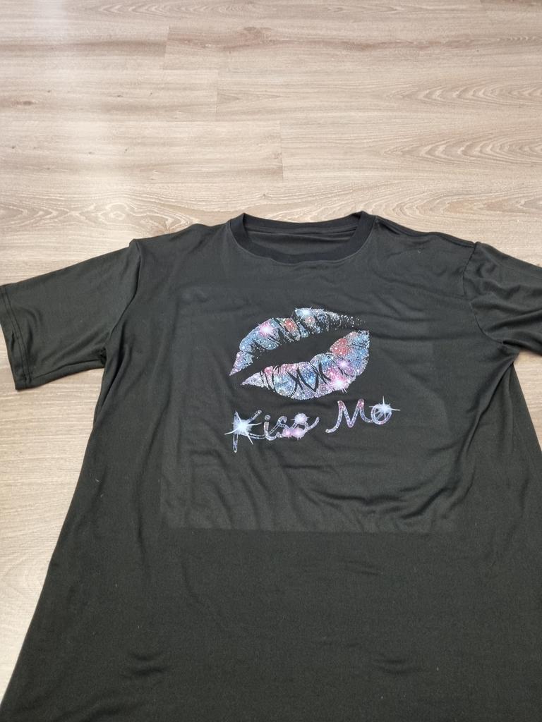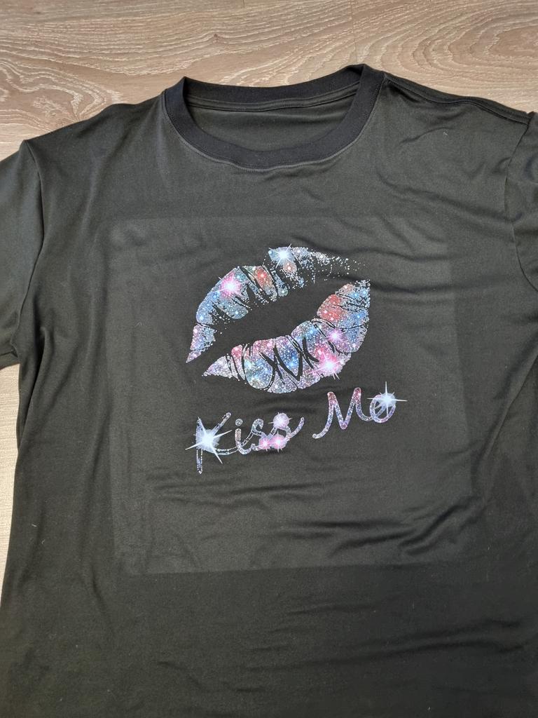 Womens Kiss Me Glitter Rhinestone Lip Print Round Neck T Shirt Summer Fashion Trendy Casual Daily Top