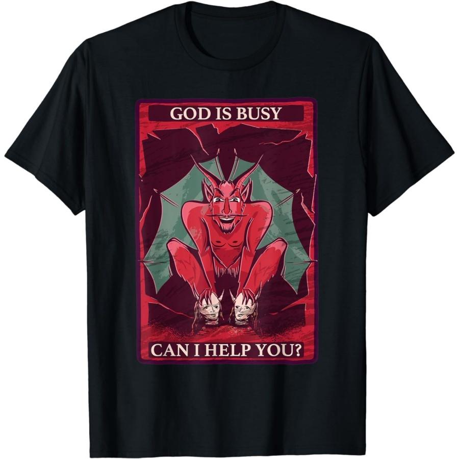 AspeAr God Is Busy Can I Help You Baphomet Occult Pentagram Satanic T-Shirt