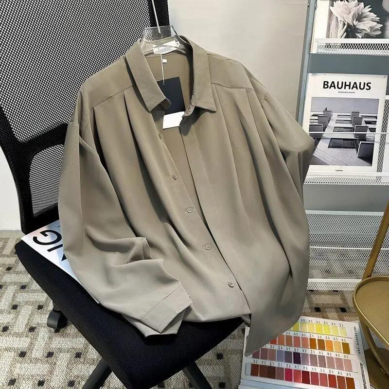 Long-sleeved Thin Shirt for Men Solid Color Drape Light Mature Style Loose Casual Trendy Lapel