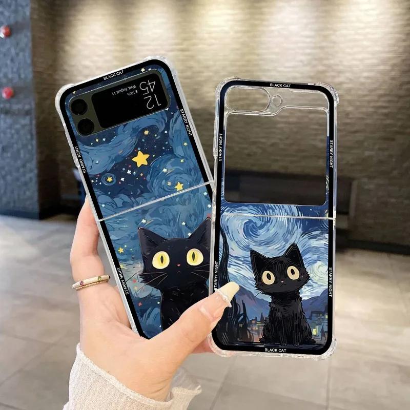 Artistic Black Cat Starry Night Phone Case For Samsung Galaxy Z Flip 6 5 4 3 5G Shockproof Cover For Samsung ZFlip3 Flip4 ZFlip5