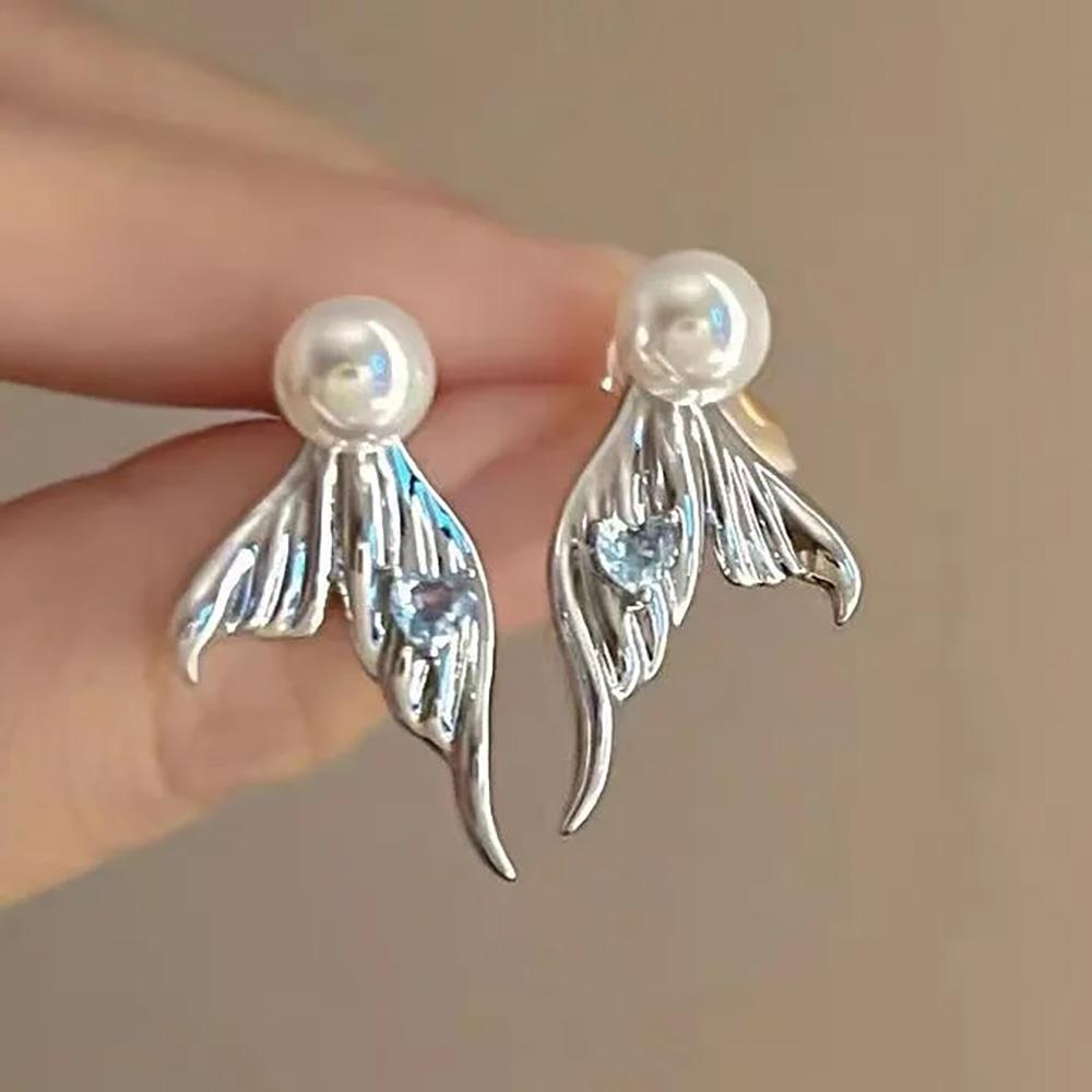 New Exquisite Mermaid Tail Pearl French Zircon Heart Stud Earrings Creative Design Dual Wearability Elegant Fashion