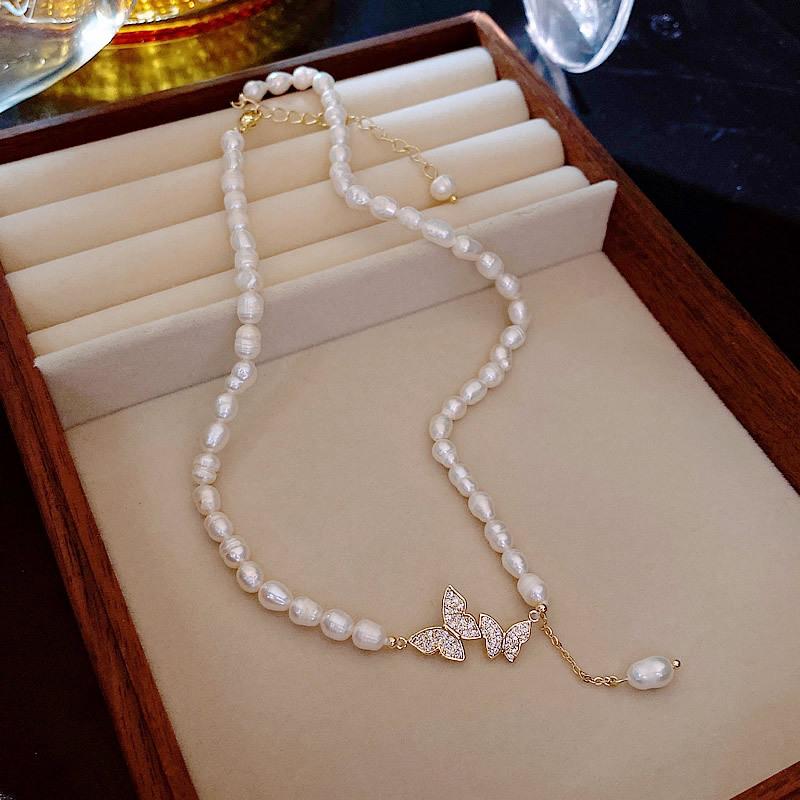 100% Natural Freshwater Pearl Sweet Butterfly Shiny CZ Zircon 14K Gold Filled Female Necklace For Women Short Chains