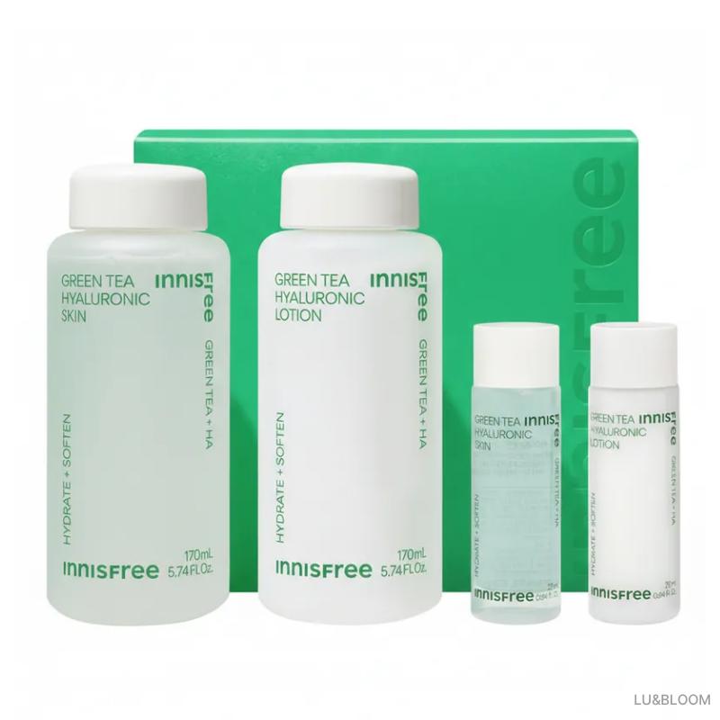 The innisfree Green Tea Hyaluronic Skincare 2-piece Set is a core hydration duo designed to replenish moisture and balance the skin's oil-water levels. Featuring "Beauty Green Tea™" and a 5-layer Hyaluronic Acid complex, this set provides a fresh, non-sticky finish that relieves "inner-skin dryness." It includes a watery skin (toner) to refine texture and a lightweight lotion to seal in moisture, making it a foundational routine for healthy, dewy skin.